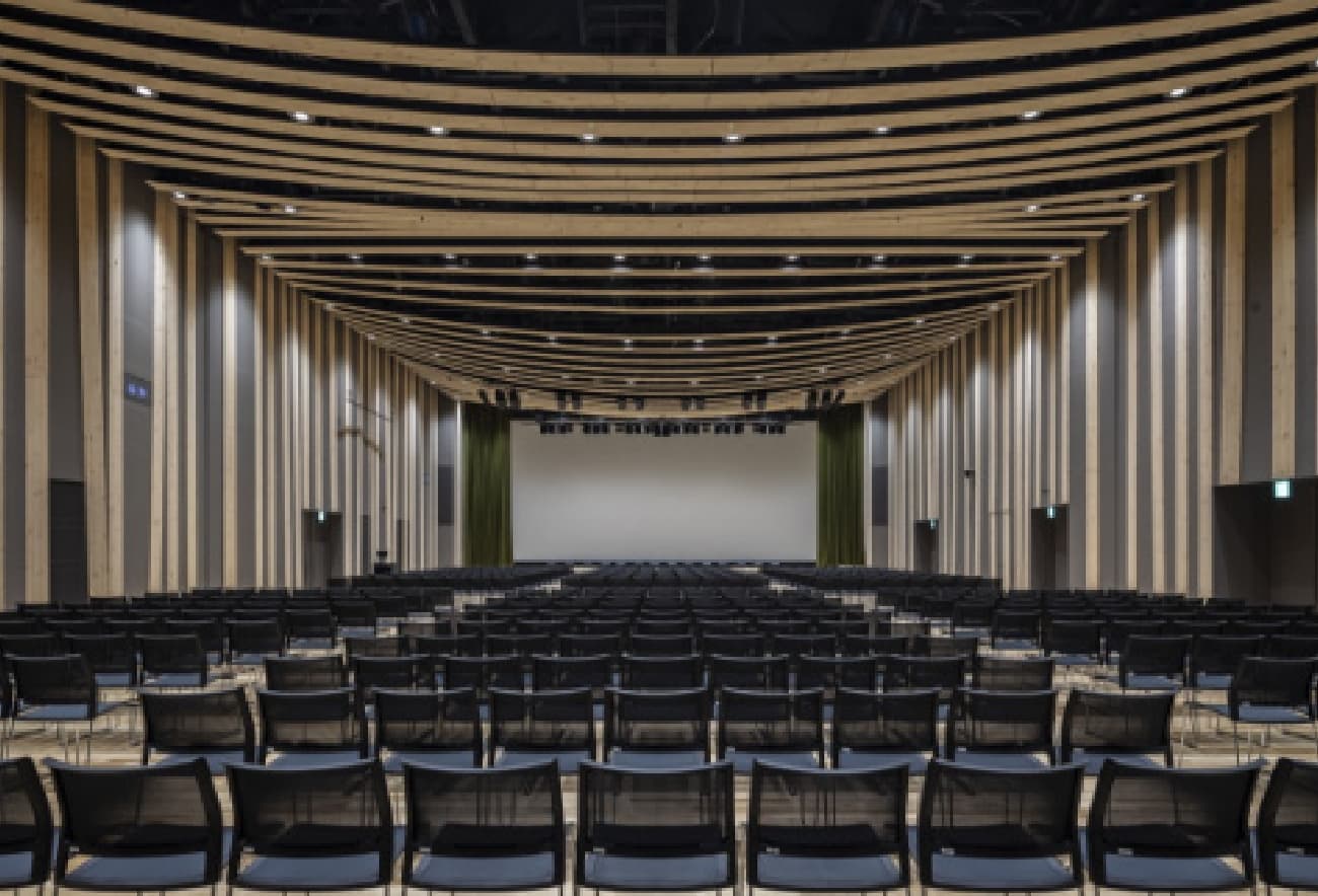 Gorgeous space with wooden drapes: suit for ceremonies and lectures.